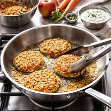 Delicate, fluffy pancakes made from grated carrot and apple — a quick, seasonal, and child-friendly snack for winter afternoons. The pancakes combine the sweetness of apple with the natural hint of carrot, are slightly sweet and moist on the inside, and golden on the outside. Served with a creamy yogurt dip with a touch of honey and lemon, they create a healthy alternative to sweet cookies. This dish is perfect as an after-preschool snack, part of a children's breakfast, or for a small gathering — they can easily be decorated with faces made from fresh fruit, which will surely delight the little ones. A simple recipe that can be quickly prepared encourages cooking together with children.