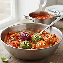 To make the dish even more appealing, arrange the pasta on the plate in the form of 'hair' sticking out from behind the meatballs. You can also use cookie cutters to cut fun shapes from vegetables (e.g., cucumber or pepper slices) and decorate the plate with them. Serve with a portion of carrot salad or cucumber salad.