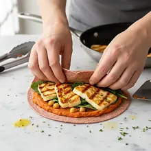 Here is a recipe for the perfect takeout dish that delights both in flavor and appearance. Colorful wraps with grilled halloumi cheese are a proposal that combines the freshness of spring vegetables, the creamy texture of homemade roasted red pepper hummus, and the distinctive salty taste of Cypriot cheese. The dish is incredibly filling and balanced, providing protein, healthy fats, and complex carbohydrates. Its greatest advantage is versatility – it tastes delicious both warm, right after preparation, and cold, after a few hours in the fridge. This makes it perfect as a lunch for work, a hearty snack for a picnic, or a light yet satisfying dinner. Juicy vegetables crunch in every bite, and the velvety hummus perfectly binds all the ingredients into a harmonious whole. This dish proves that takeout food can be healthy, delicious, and beautiful.