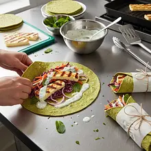 You can serve the wraps immediately, cut in half at a sharp angle, which will beautifully showcase the colorful filling. If you're packing them to go, wrap each wrap tightly in parchment paper or aluminum foil. Repeat the folding and rolling process for the remaining three tortillas.