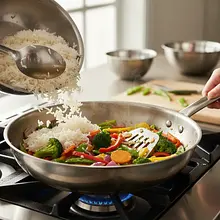 Delikatnie mieszaj, aby nie połamać ziaren ryżu. Najlepiej jest podrzucać składniki na patelni lub delikatnie przekładać je od spodu ku górze za pomocą szerokiej łopatki.