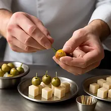 Serve the skewers immediately or after a slight chill (10–15 minutes in the fridge) – the cheese will then be firmer. If you prepare them in advance, arrange the skewers loosely in a single-layer container and cover with plastic wrap. Do not store for longer than 24 hours, as the olives may release moisture and the cheese will lose its firmness.