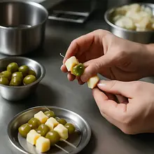 Take a toothpick and arrange the ingredients on it in a repeating order, e.g.: cube of cheese → olive → slice of cucumber (whole or half) → strip of pepper (wrapped or laid flat). Leave about 1 cm of free space at the base of the toothpick so that the skewer does not break and can be held comfortably. Gently skewer each piece so that the ingredients do not fall apart. The average time for one skewer is 20–30 seconds; preparing about 30–40 skewers will take 20–25 minutes.