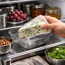 Take the blue cheese out of the fridge 10-15 minutes before cutting so that it is not too hard or too soft. Place the cheese on a cutting board and use a sharp, large knife. Cut off the rind if you prefer smaller pieces (the rind is edible). While cutting, slice the flesh in parallel motions into cubes with sides of about 18–22 mm (about 20 g per cube). For 200 g of cheese, you will get about 8–10 cubes. If the cheese is very soft, chill it in the fridge for 10 minutes before cutting. Time: 5–7 minutes.