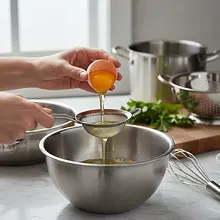 Separate the egg whites from the yolks. Make sure not a bit of yolk gets into the egg whites, as this will make whipping difficult. In a large, clean, and dry bowl, start whipping the egg whites with a pinch of salt on medium speed. When the mixture becomes white and thick, begin adding sugar, one tablespoon at a time, while continuing to whip. After all the sugar has been added, increase the mixer speed to the highest and whip for another 2-3 minutes.