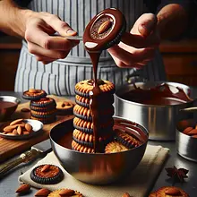 Delicate, soft gingerbread cookies inspired by traditional gingerbread, but with a modern twist: aromatic gingerbread dough made from flour and butter, with a soft filling of caramel and ground almonds, all dipped in a glossy dark chocolate glaze. This dessert features rich, festive notes of cinnamon, ginger, and cloves, with a sweet-salty decorative accent. It pairs wonderfully with coffee, tea, or as an elegant gift for winter occasions. It looks decorative (the contrast of dark chocolate with the green of pistachios or orange zest), and in flavor, it combines crunchy edges with a soft, chewy center.