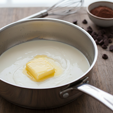 In a small saucepan with a thick bottom, place the 36% cream and butter cut into smaller pieces. Heat over medium heat, stirring occasionally with a silicone spatula, until the butter is completely melted. Increase the heat and bring the mixture almost to a boil – you will notice small bubbles appearing at the edges of the saucepan. Remove the saucepan from the heat just before the liquid starts to boil vigorously.