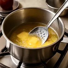 Melt 150 g of butter in a medium saucepan over medium heat. When the butter has melted, reduce the heat and stir constantly with a wooden spoon; after a few minutes, the white milk proteins will start to brown and a nutty aroma will develop. The whole process takes 5–7 minutes. Remove the pot from the heat, pour the butter through a strainer into a glass bowl (the sediment will separate) and set aside to cool slightly (about 10 minutes) — it should be warm, not hot.