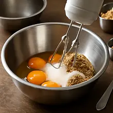 In a large bowl, place 180 g of eggs (3 pieces), 150 g of white sugar, and 50 g of brown sugar. Beat with a mixer on medium speed for 2–3 minutes until the mixture becomes lighter and slightly fluffy. Add 30 g of honey and 10 g of vanilla extract, then slowly pour in the cooled, warm butter (150 g) in a thin stream while continuously mixing on low speed. Finally, add 200 g of sour cream and mix briefly until combined (15–20 seconds).