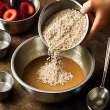 Prepare the crumble: in a bowl, combine 60 g of all-purpose flour, 40 g of white sugar, and 50 g of cold butter (taken out of the fridge earlier). Cut the butter into pieces and rub it with your fingers or use a pastry cutter until the mixture resembles larger crumbs (the size of peas). If desired, add 30 g of almond flakes (optional) and gently mix in.