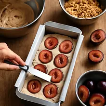 Pour the batter into the prepared loaf pan, smoothing the top with a spatula. Arrange the halved plums cut side down in rows or irregularly, depending on your aesthetic, gently pressing them into the batter (not too deep). Evenly sprinkle the prepared crumble and almond flakes (if using) on top. Finally, heat 30 g of honey for 10 seconds in the microwave or in a saucepan and lightly brush the top with a pastry brush — this will give it a beautiful shine.