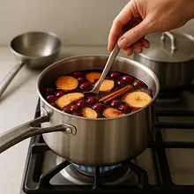 When the drink is hot, cover the pot with a lid and leave it on the lowest possible heat for about 20 minutes. This process, called infusion, will allow all the flavors and aromas from the spices, orange, and ginger to fully permeate the juices. The drink should gently 'simmer' but not boil.
