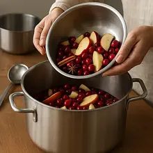 Non-alcoholic apple-cranberry mulled drink is the essence of autumn-winter comfort captured in a mug. Its deep ruby color catches the eye, and the aroma of cinnamon, cloves, and orange wafting through the air instantly creates a cozy atmosphere. The taste is a perfect balance between the sweetness of natural apple juice and the tartness of cranberry, complemented by a citrus note and the warming heat of spices. This drink comes from the tradition of European mulled beverages, such as the English 'wassail' or the German 'Kinderpunsch', serving as their non-alcoholic counterpart. It is perfect as a drink for chilly evenings, gatherings with family and friends, and as an elegant and safe option for drivers during holiday parties. Served hot, in thick glasses or mugs, garnished with a slice of orange and a star anise, it becomes not just a drink but a true ritual of celebrating the winter atmosphere.