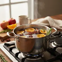 Postaw garnek na średniej mocy palnika. Powoli podgrzewaj mieszankę, aż stanie się bardzo gorąca i zaczną pojawiać się pierwsze pęcherzyki powietrza przy brzegach garnka (potrwa to ok. 5-7 minut). Ważne jest, aby NIE DOPROWADZIĆ napoju do wrzenia. Gdy tylko zauważysz, że grzaniec ma zaraz zacząć wrzeć, natychmiast zmniejsz moc palnika do minimum. Przykryj garnek pokrywką, pozostawiając małą szczelinę i podgrzewaj na minimalnym ogniu przez 15-20 minut. Ten proces pozwoli przyprawom uwolnić pełnię aromatu bez utraty walorów smakowych soku.