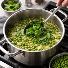 Before serving, taste the soup once more, checking the balance of the sweetness of the peas, the acidity of the lemon, and the salt. The soup is ready when the consistency is silky, the flavor is balanced, and the aroma of mint is noticeable but not overpowering.