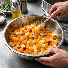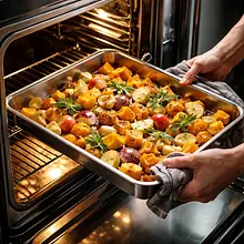 Place the tray in the preheated oven and bake for 35–45 minutes, moving the tray halfway through and gently stirring the pieces with a spatula to ensure even browning. After 35 minutes, check by piercing the largest piece with a fork — it should go in easily, and the edges of the vegetables and apples should be slightly caramelized and golden-brown.