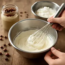 Combine the mascarpone mixture with the whipped cream: add 1/3 of the whipped cream to the mascarpone and mix vigorously but gently to loosen the mixture (about 20–30 seconds). Then add the remaining cream in two batches and gently fold with a spatula for 30–40 seconds per batch until a smooth, fluffy cream is formed. The cream should be thick but light — if it "flows," it means the mascarpone is too thin or the cream is overwhipped.