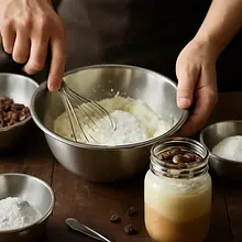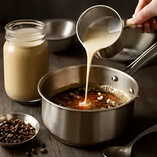 A delicate, creamy dessert in a jar that combines the intense flavor of coffee with the velvety texture of mascarpone and cream, along with crunchy homemade caramel made from roasted coffee beans. Inspiration: coffee as an ingredient not just for drinking — here, the beans become a textural and decorative element. The dessert has layers: a buttery cookie base, a coffee cream made from mascarpone and cream with a hint of vanilla, and shiny caramel with slightly crushed roasted coffee beans. Serve in small jars as a dessert after dinner or as a sweet touch during afternoon coffee. Qualities: a contrast of creamy smoothness and crunchiness, a pleasant bitter-sweet note of coffee, and aesthetic layering that looks very impressive.