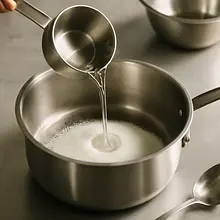 Prepare the caramel with seeds: in a heavy-bottomed saucepan, add 120 g of granulated sugar and pour in 30 ml of water (just enough to moisten the sugar). Do not stir with a spoon — gently shake the saucepan to allow the sugar to dissolve evenly. Heat over medium heat for 6–8 minutes until the sugar dissolves and the mixture turns amber in color. Watch carefully — caramel that is too dark tastes bitter.