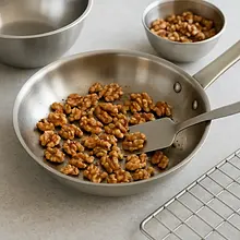 Start by toasting the walnuts, as they need to cool down. Heat a dry skillet (without oil) over medium heat. Add the walnuts and toast them for 3-5 minutes, stirring or shaking the skillet frequently. Be vigilant, as the nuts can easily burn. You'll know they're ready by the intense, nutty aroma and a slight golden color. Immediately transfer them to a cold plate to stop the toasting process. Once completely cooled, chop them coarsely with a knife.