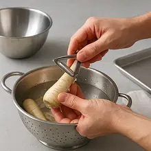 Prepare the chips. Thoroughly wash, dry, and peel the parsley root. Using a vegetable peeler or a mandoline, slice the parsley into very thin, long ribbons. In a small saucepan, heat vegetable oil over medium heat. The oil is ready when a piece of parsley dropped in starts to sizzle. Fry the chips in batches for about 1-2 minutes on each side, until they become golden and crispy. Remove them with a slotted spoon and place them on a plate lined with paper towels to drain excess fat. Lightly salt them immediately after frying.