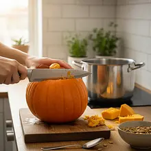 Thoroughly wash the pumpkin under running water. Dry it with a paper towel. Using a large, sharp knife, cut the pumpkin in half. Be careful, the skin is tough, so do this carefully on a stable cutting board. Using a large metal spoon, scoop out the seeds and fibrous flesh from the center of both halves. Then, cut the pumpkin into smaller pieces, for example, into eighths or thick slices about 3-4 cm wide.