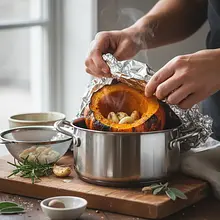 Place the pumpkin pieces in a large bowl. Drizzle them with the remaining two tablespoons of olive oil, add a teaspoon of salt and a pinch of pepper. Mix thoroughly with your hands to ensure each piece is evenly coated with oil and spices. Spread the pumpkin in a single layer on the prepared baking sheet. Place a head of garlic wrapped in foil next to it. Put the baking sheet in the preheated oven and bake for 30-40 minutes.