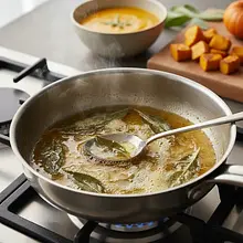 W czasie gdy zupa się gotuje, przygotuj masło szałwiowe. Na małej patelni, najlepiej z jasnym dnem, rozpuść masło na średniej mocy palnika. Gdy masło się rozpuści i zacznie pienić, dodaj całe listki szałwii. Smaż przez około 2-3 minuty, delikatnie mieszając, aż masło nabierze złotobrązowego koloru i zacznie pachnieć orzechami, a listki szałwii staną się chrupiące. Zdejmij patelnię z ognia, aby nie spalić masła.