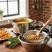 Gdy warzywa będą już upieczone i miękkie, ostrożnie wyjmij blachę z piekarnika. Za pomocą łopatki przełóż całą zawartość blachy – dynię, marchew, cebulę i czosnek – do dużego garnka o grubym dnie.