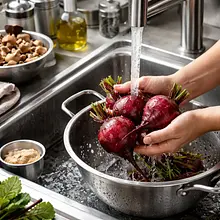 Preheat the oven to 200°C (fan). Thoroughly wash and dry the beets, but do not peel them. Just trim the ends. Wrap each beet tightly in aluminum foil. Place the wrapped beets on a baking sheet and put them in the preheated oven. Bake for about 60-90 minutes. The baking time depends on the size of the beets. To check if they are ready, carefully unwrap the foil and pierce the beet with a knife or fork - it should go in easily, which means the beet is soft inside.