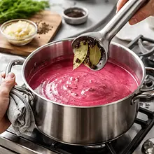 Place the pot with the blended soup back on low heat. Do not bring it to a boil. Pour in the 30% cream, add freshly grated horseradish and apple cider vinegar. Mix everything thoroughly with a whisk or spoon. Taste the soup and season with salt and freshly ground black pepper to your liking. Heat for another minute, stirring constantly, until the soup is hot.