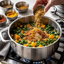 Drain the chickpeas in a sieve and rinse thoroughly under cold running water. Add the rinsed chickpeas to the pot with the soft pumpkin. Stir and cook together for 2-3 minutes to combine the flavors. Then add the washed spinach. You can add it in batches. Cover the pot for a minute – the steam will help the spinach wilt. Then gently stir until all the leaves 'disappear' into the curry.