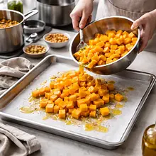Preheat the oven to 200°C (fan). Thoroughly wash the hokkaido pumpkin under running water, then dry it with a paper towel. Place the pumpkin on a stable cutting board, cut off the tough stem and the base. Cut it in half and use a large spoon to remove the seeds and fibrous flesh from the inside. Cut the pumpkin halves into cubes about 2-3 cm on each side. Remember, you do not need to peel the skin of the hokkaido pumpkin – it will soften during baking and is edible.