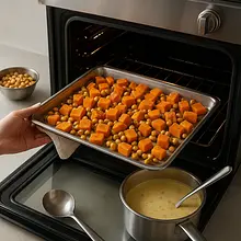 Place the baking sheet with the pumpkin in the preheated oven. Bake for about 30-35 minutes. Halfway through baking (after about 15 minutes), stir the pumpkin pieces with a spatula. The pumpkin is ready when a fork easily pierces it and its edges are slightly browned and caramelized.