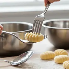 To create grooves, take one gnocchi and gently slide it over the tines of a fork, lightly pressing with your thumb. This will create a dimple on one side and ridges on the other. These grooves help the sauce adhere better to the gnocchi. You can also use a special wooden gnocchi board.