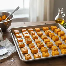 Spread the seasoned pumpkin in a single layer on the prepared baking sheet. Place in the preheated oven and bake for 25-30 minutes. Halfway through baking, stir the pumpkin with a spatula. The pumpkin is ready when it is soft (a fork can easily pierce it) and has lightly browned, caramelized edges.