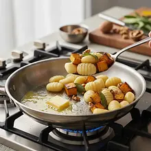 Add the cooked and drained gnocchi and the roasted pumpkin cubes to the sauce in the pan. Gently mix everything, tossing the pan or using a wide spatula, so that the sauce coats each piece and the pumpkin does not break apart.