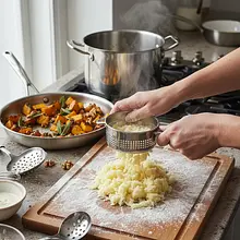 When the potatoes are still very hot, but cool enough to hold in your hand (use an oven mitt or a clean cloth), cut them in half and peel off the skin. Then, press the flesh through a potato ricer directly onto a clean, floured work surface or into a large bowl.