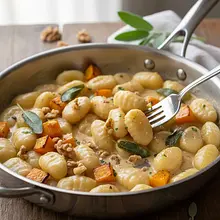 This dish is the essence of autumn captured on a plate. Imagine delicate, melt-in-your-mouth potato dumplings, enveloped in a velvety butter-cream sauce with aromatic sage. The sweetness of roasted hokkaido pumpkin perfectly complements the nutty flavor of browned butter and the crunch of toasted walnuts. The whole is completed by a bold, salty accent of freshly grated parmesan. This dish comes from Italian tradition, where gnocchi are loved for their simplicity and versatility, but in this version, it gains a modern, seasonal character. It is not only incredibly delicious but also beautifully presented on the plate thanks to the contrasting colors of orange pumpkin, green sage, and golden dumplings. Perfect for an elegant dinner, a family meal on a chilly day, or when you simply crave something special and comforting.