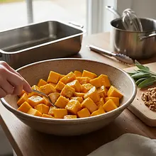 Preheat the oven to 200°C (fan) or 220°C (top-bottom). Wash the hokkaido pumpkin thoroughly. Since its skin is edible, you don't need to peel it. Cut the pumpkin in half, and then use a spoon to remove the seeds along with the fibers. Cut the flesh into cubes about 2-3 cm on each side. Make sure the cubes are roughly the same size so they bake evenly.