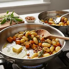 While the pumpkin is baking, prepare the gnocchi. In a large pot, bring about 3 liters of water to a boil. When the water starts to boil vigorously, add a generous pinch of salt (about 1 teaspoon). Carefully drop the gnocchi into the boiling water. Gently stir with a wooden spoon to prevent them from sticking to the bottom. Cook them according to the package instructions, usually for 2-3 minutes. The gnocchi are ready when they float to the surface of the water. Scoop them out with a slotted spoon and set aside. Reserve about half a cup (100 ml) of the cooking water – it will be useful for the sauce.