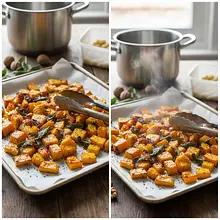 Place the baking tray with the pumpkin in the preheated oven and bake for about 25-30 minutes. Halfway through baking (after about 15 minutes), stir the pumpkin with a spatula to ensure even cooking. The pumpkin is ready when a fork easily pierces it, and its edges are slightly browned and caramelized.