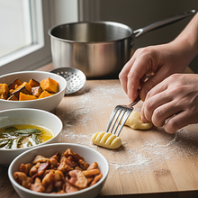 Teraz czas na nadanie gnocchi charakterystycznego kształtu. Weź jedną kluseczkę i delikatnie przesuń ją po ząbkach widelca, jednocześnie lekko dociskając kciukiem. W ten sposób z jednej strony powstaną rowki (które świetnie trzymają sos), a z drugiej małe wgłębienie. Gotowe gnocchi odkładaj na deskę lub tacę obficie posypaną mąką, tak aby się nie stykały.