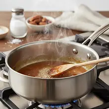 Prepare the caramel sauce. In a heavy-bottomed saucepan, place the sugar and melt it over medium heat without stirring with a spoon. You can only gently swirl the entire saucepan to ensure the sugar melts evenly. Once all the sugar has melted and has a beautiful amber color (like tea), reduce the heat to the lowest setting. Add the diced butter. Note that the mixture will start to bubble and splatter intensely! Whisk vigorously with a kitchen whisk until the butter is completely combined with the caramel.