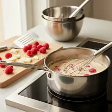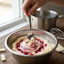 Discover the magic of homemade ice cream without the need for a specialized machine! This recipe is the essence of a creamy dessert that combines the richness of classic cheesecake with the refreshing, slightly tangy note of raspberries and the sweetness of melting white chocolate. The ice cream has an incredibly smooth, velvety texture thanks to the mascarpone cheese and whipped cream base. Each spoonful is a journey through layers of flavors and textures: from the silky cheese mixture, through the intense homemade raspberry sauce, to the crunchy pieces of cookies and sweet white chocolate shavings. Perfect for a summer afternoon, an elegant dessert after dinner, or simply as a moment of sweet indulgence. Serve it in bowls, cones, or as a topping for warm brownies.