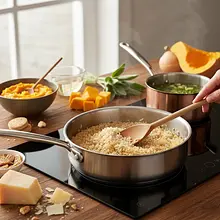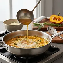 To danie to kwintesencja jesieni zamknięta na talerzu. Kremowe risotto dyniowe jest klasycznym włoskim daniem, które zyskuje głębię i sezonowy charakter dzięki dodatkowi słodkiego, aksamitnego purée z dyni Hokkaido. Jego naturalna słodycz idealnie komponuje się z wytrawnym białym winem, intensywnym smakiem sera Parmigiano Reggiano oraz ziemistym, lekko pikantnym aromatem świeżej szałwii, usmażonej na chrupko w maśle. Konsystencja risotto jest kluczowa – każde ziarenko ryżu Arborio powinno być idealnie 'al dente', czyli lekko twardawe w środku, otulone gęstym, kremowym sosem powstałym ze skrobi ryżowej, bulionu, masła i sera. Danie ma piękny, ciepły, pomarańczowy kolor, który wspaniale kontrastuje z głęboką zielenią listków szałwii i bielą świeżo startego parmezanu. Podawaj je jako eleganckie danie główne na jesienną kolację lub jako sycący, komfortowy posiłek w chłodny dzień.