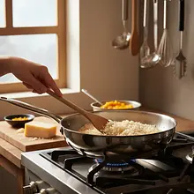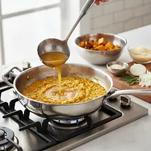 Reduce the heat to medium-low. Using a ladle, pour in the first portion of hot broth, just enough to cover the rice. Stir slowly and almost continuously until the rice absorbs all the liquid. Only then add another ladle of broth. Repeat this process patiently, ladle by ladle, for about 10 minutes. Stirring releases the starch from the grains, creating a natural, creamy emulsion.