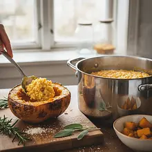 This dish is the essence of autumn captured on a single plate. Creamy pumpkin risotto is incredibly aromatic, warming, and satisfying, combining the sweetness of roasted pumpkin, the nutty flavor of Arborio rice, the depth of Parmesan, and the earthy aroma of crispy sage. Originating from northern Italy, risotto is a cooking technique, not just a dish, involving the slow absorption of broth by starchy rice grains, which creates its characteristic creamy texture without the use of cream. The dish has a beautiful, warm orange color, and its rich flavor pairs perfectly with a glass of dry white wine. Serve it as an elegant main course for an autumn dinner or as a hearty vegetarian lunch.