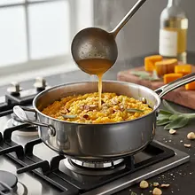 Reduce the heat to medium-low. Using a ladle, pour the first portion of hot broth over the rice – just enough to barely cover the rice. Stir slowly and almost continuously until the rice absorbs all the liquid. Only then add another ladle of broth. Repeat this process patiently.