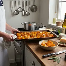 Gdy dynia się piecze, przygotuj chrupiące prosciutto. Na drugiej blasze, również wyłożonej papierem do pieczenia, rozłóż pojedynczo plastry szynki Prosciutto di Parma. Upewnij się, że plastry nie nachodzą na siebie. Wstaw blachę do tego samego piekarnika na ostatnie 5-7 minut pieczenia dyni. Obserwuj szynkę uważnie, ponieważ jest cienka i łatwo ją przypalić. Gotowe chipsy z prosciutto powinny być chrupiące i lekko zarumienione. Po wyjęciu z piekarnika przełóż je na talerz wyłożony ręcznikiem papierowym, aby odsączyć nadmiar tłuszczu.